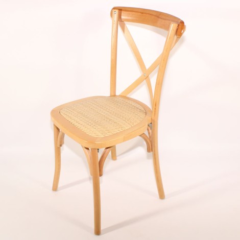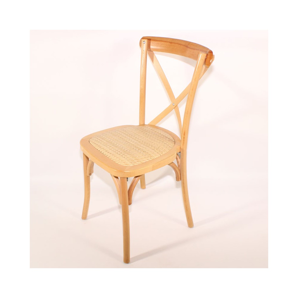 Silla crossback de madera de haya con asiento de ratán natural, perfecta para eventos que requieren elegancia y funcionalidad. Apilable hasta 10 unidades, ligera y resistente, ideal para bodas y hostelería.